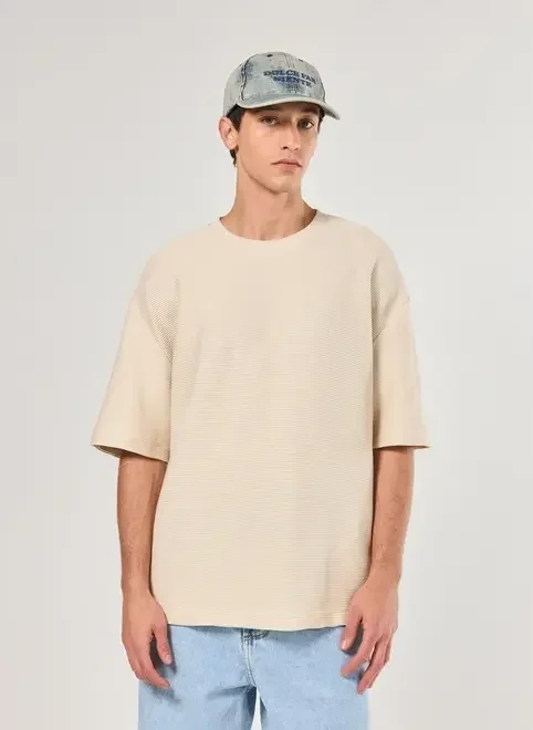 camiseta de manga curta em tom areia, com textura canelada. com os diferenciais da modelagem box, que possui caimento amplo e mais “quadrado”