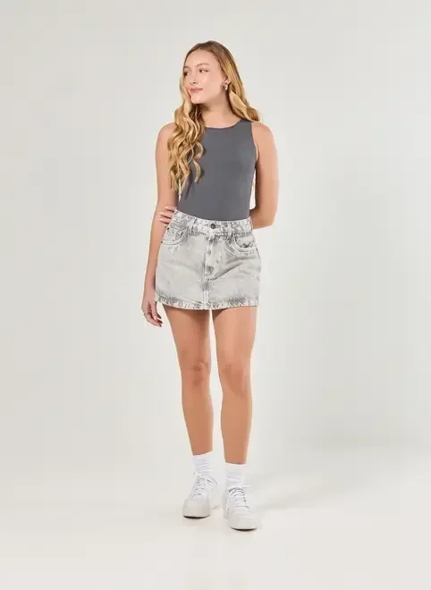 short saia jeans de cintura alta, a peça chave que traz versatilidade e conforto pro look